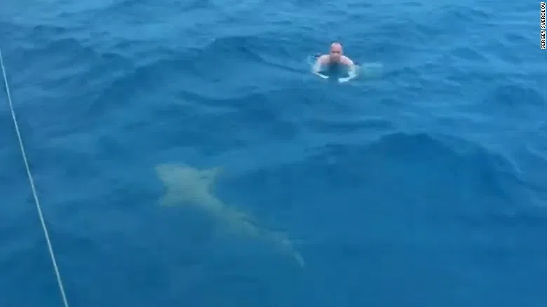 A swimmer got quite the surprise when he nearly swam into a shark. Sergey Sverdlov caught the encounter on camera.