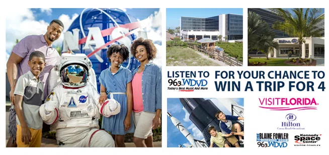 So, ready to ditch the cold and hit the beach? Then, listen for your chance to win an escape to Florida’s Space Coast! You win a four-night vacation for four to Hilton Cocoa Beach Oceanfront, including admission for four to Kennedy Space Center Visitor Complex, plus round-trip coach class air transportation for four and a five-day rental car.