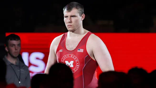 April 20, 2024 ~ University of Michigan alum and three-time NCAA All-American wrestler Adam Coon clinches his Paris Olympics qualification during the 2024 U.S. Olympic Wrestling Trials inside the Bryce Jordan Center at Penn State University in State College, Pennsylvania.