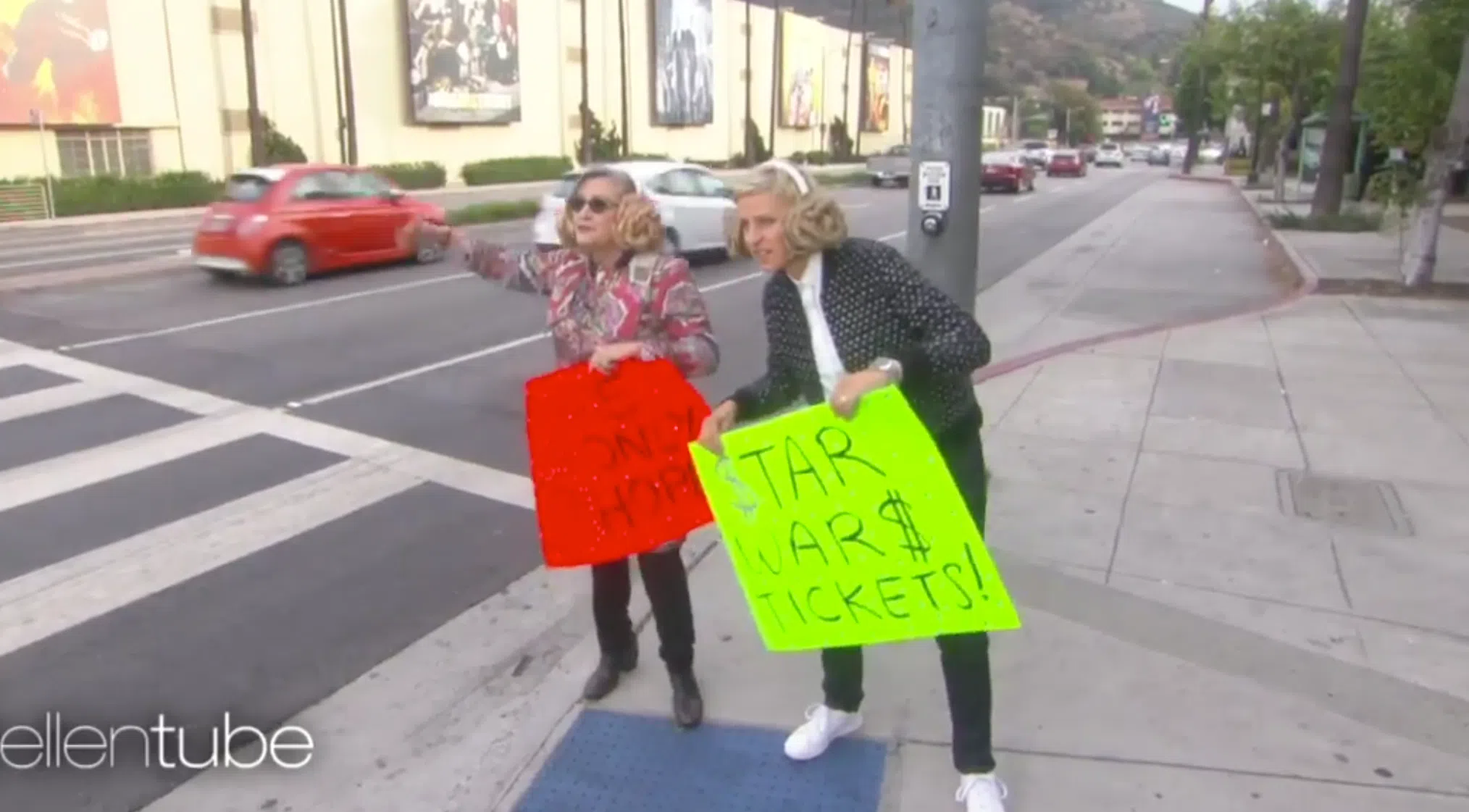 Carrie Fisher and Ellen DeGeneres sell Star Wars tickets on the street
