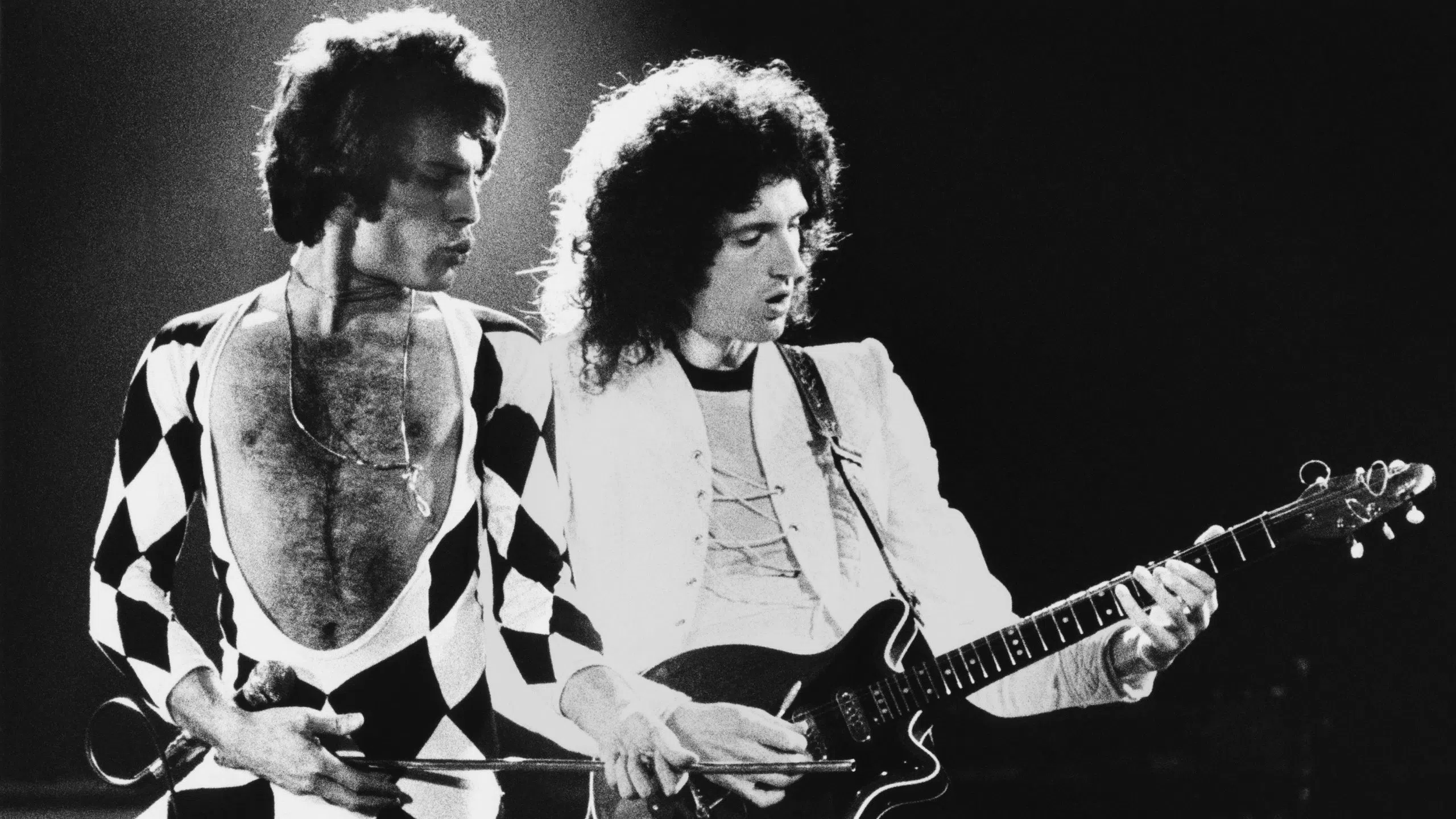 **This image is for use with this specific article only.** Singer Freddie Mercury and guitarist Brian May of the rock group Queen perform during a 1978 concert. Credit: George Rose/Hulton Archive/Gett...