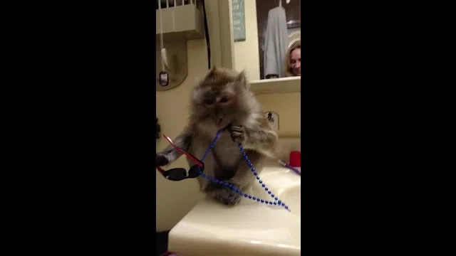 Angel the monkey showed off her great Mardi Gras style for the big festival. She looked ready party with her holiday shades and beads on, but she still had time to monkey around. Credit: Teresa Bulloc...