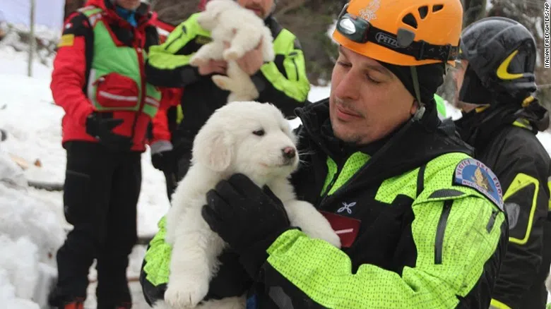 Three fluffy Abruzzo sheepdog puppies were rescued from a hotel in Italy which had been buried by an avalanche.