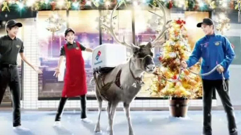 Domino’s Japan is testing a new delivery system: pizza by reindeer. Jeanne Moos reports.