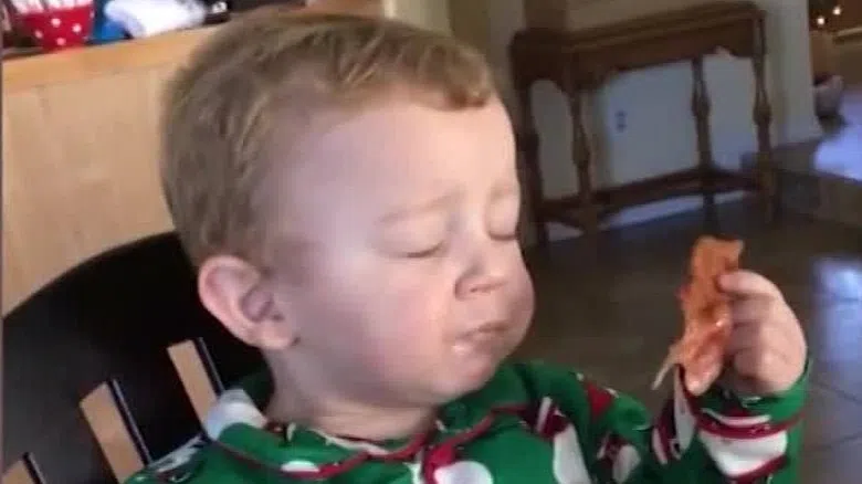 A parent films his son eating bacon for the first time and his reaction was priceless.