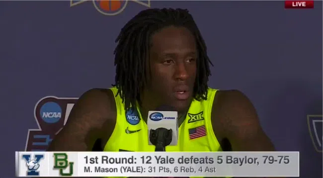 Yesterday, Yale beat Baylor in the NCAA tournament, and it was a HUGE upset. They somehow managed to out-rebound Baylor 36 to 32, and won the game by a score of 79 to 75. Afterwards, a reporter asked ...
