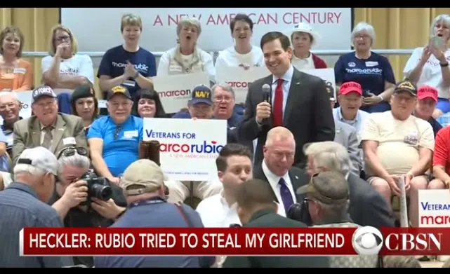 Marco Rubio was speaking in Florida on Sunday, and a heckler got up and said Rubio was trying tosteal his girlfriend. Rubio actually took it pretty well . . . he made a couple jokes of his own. The he...
