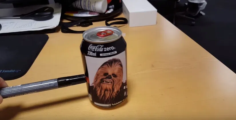 A can of a special “Star Wars” edition Coke Zero has Chewbacca’s face on it. It’s being pushed across a table, and it makes a sound exactly like Chewbacca’s groan.