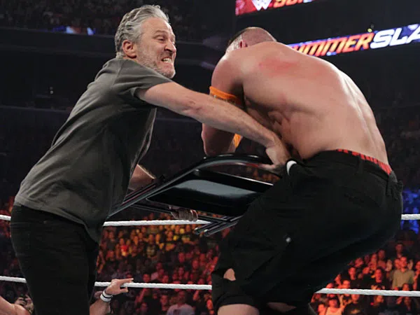 Jon Stewart attacked John Cena with a steel chair during WWE Summer Slam. Don’t worry this isn’t violent just funny to see Jon Stewart in action.