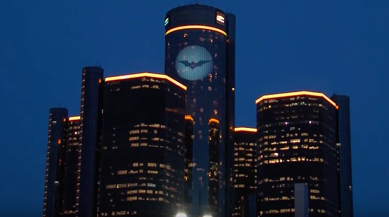 Batman in the D! The Bat Symbol on the GM Ren Cen, LEGO Batmobile at the auto show